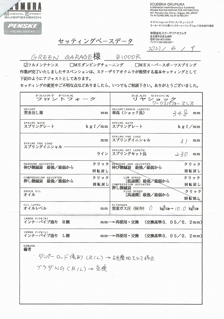 装着していたワークスパフォーマンスのリヤショックですが、オイル漏れが始まったのでスクーデリアオクムラさんでオーバーホールしていただき、今回は約3週間で完成です。