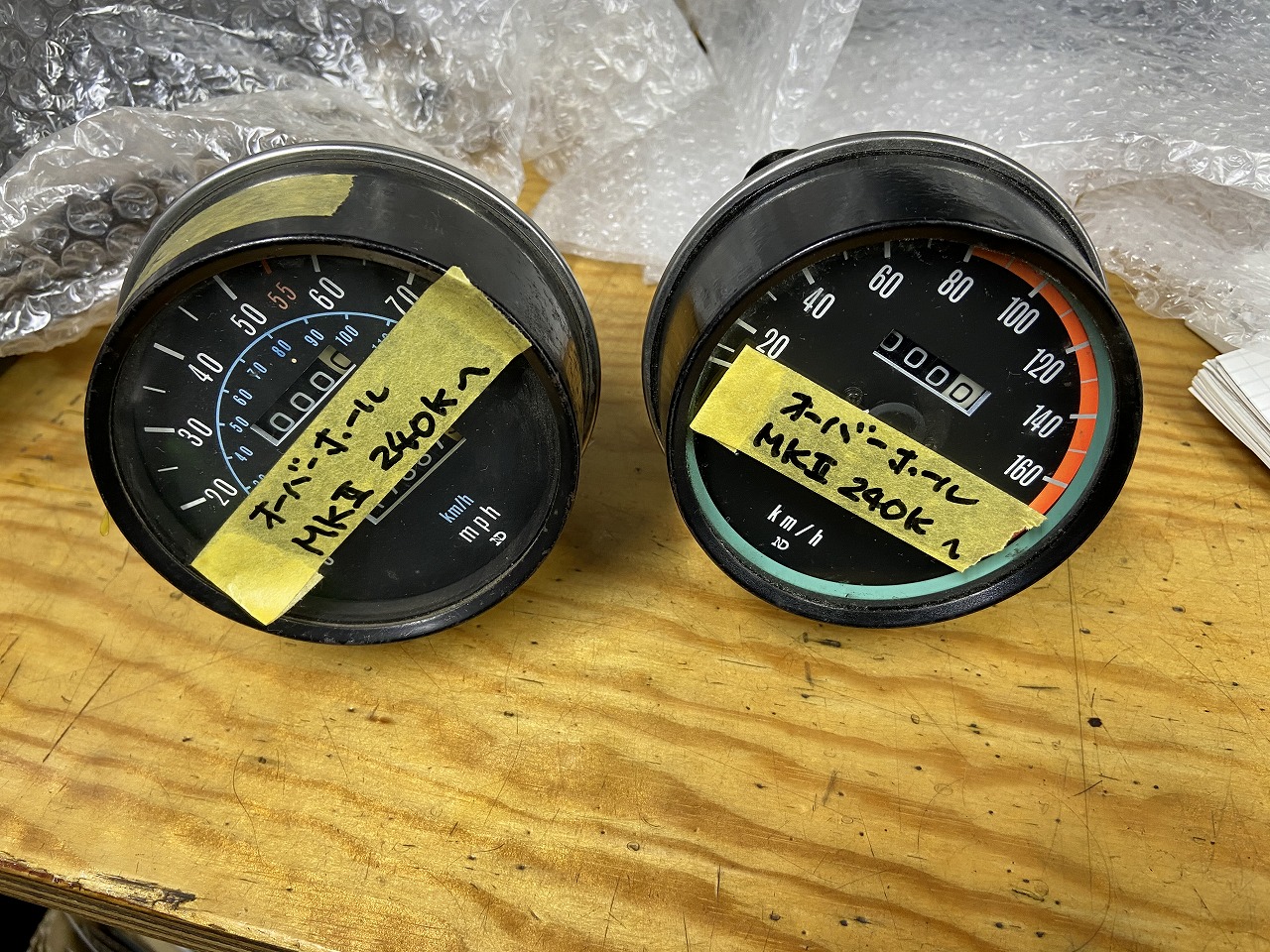 スピードメーターはこちらの2個をチョイス。右は国内Z2など用の180キロスケールのもの。左は北米輸出用マイルスケールのMk2用です。