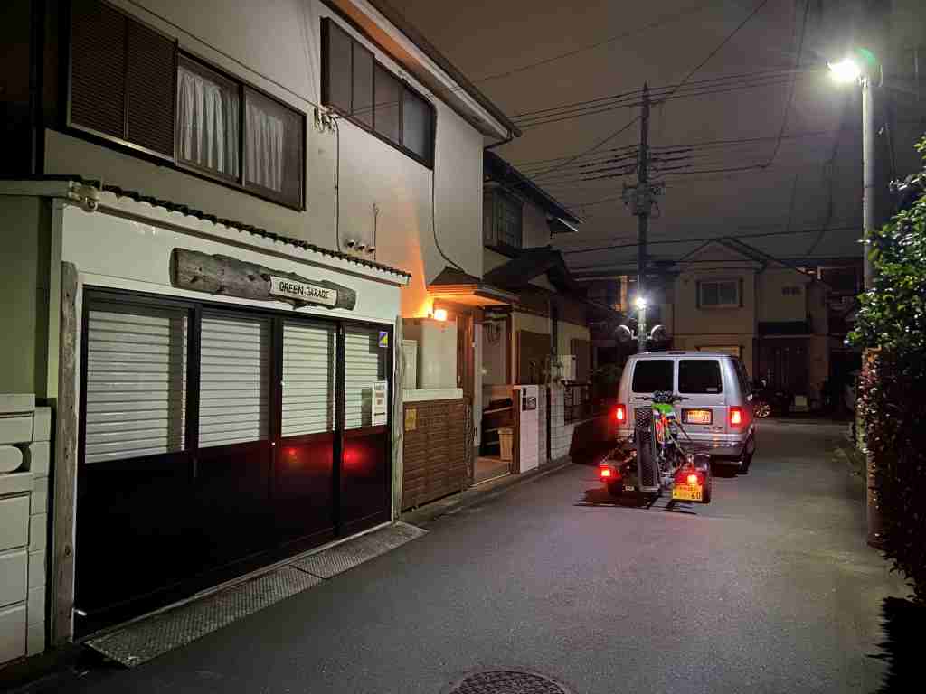 TOT前日の早朝、まだ暗いうちにガレージを出発します。今回は機材が多いので、マシンはトレーラーに載せて引いていきます。
