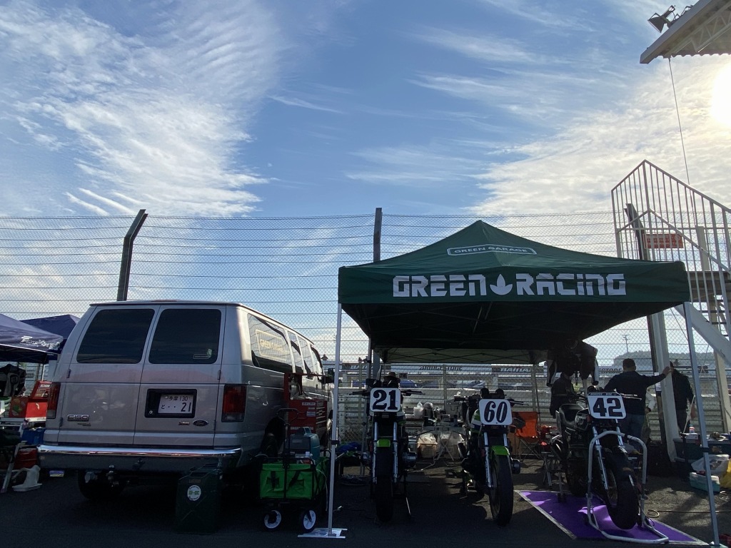 MONSTER決勝の土曜日は曇りのち雨の予報だったので、リヤが70扁平でウエット性能も良さそうなハイグリップのピレリファントムを履くことに。もう市場に新品タイヤは無かったので中古品です。