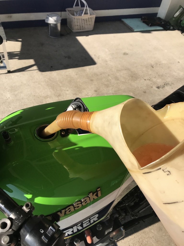 軽量化のため、ガソリンは走行前に走行分だけ補充します。走行時間が1回25分ほどなので約22周ほど周回可能です。レーシング燃費は7km/L位なので、毎回6Lほど入れれば十分です。