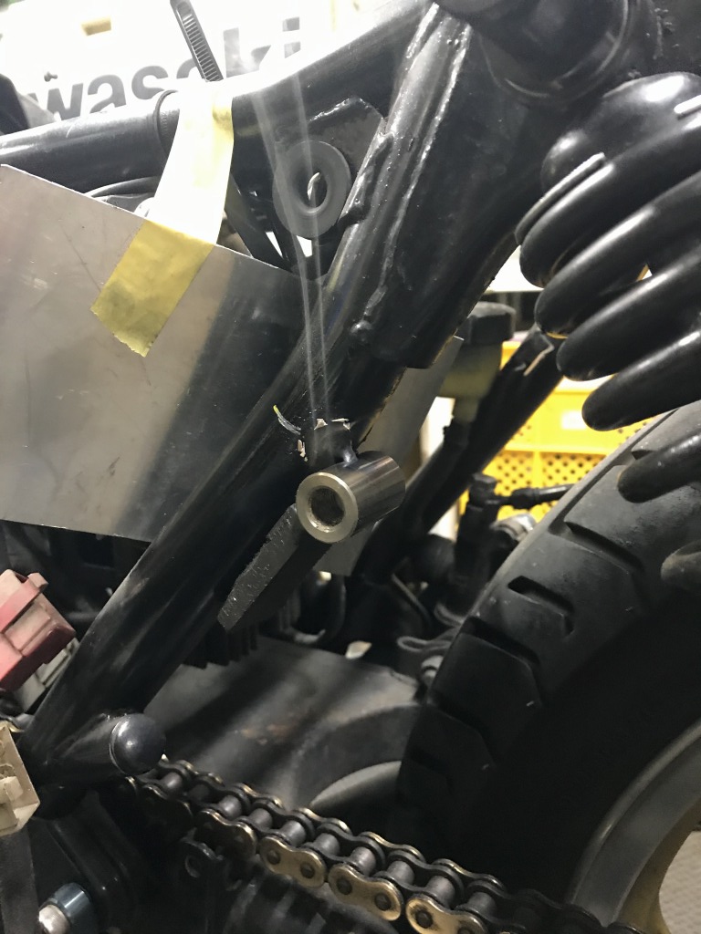 タンデムステップ用のボスを製作し、フレームに溶接します。お子さんが乗るので高い位置でもOKとのこと。