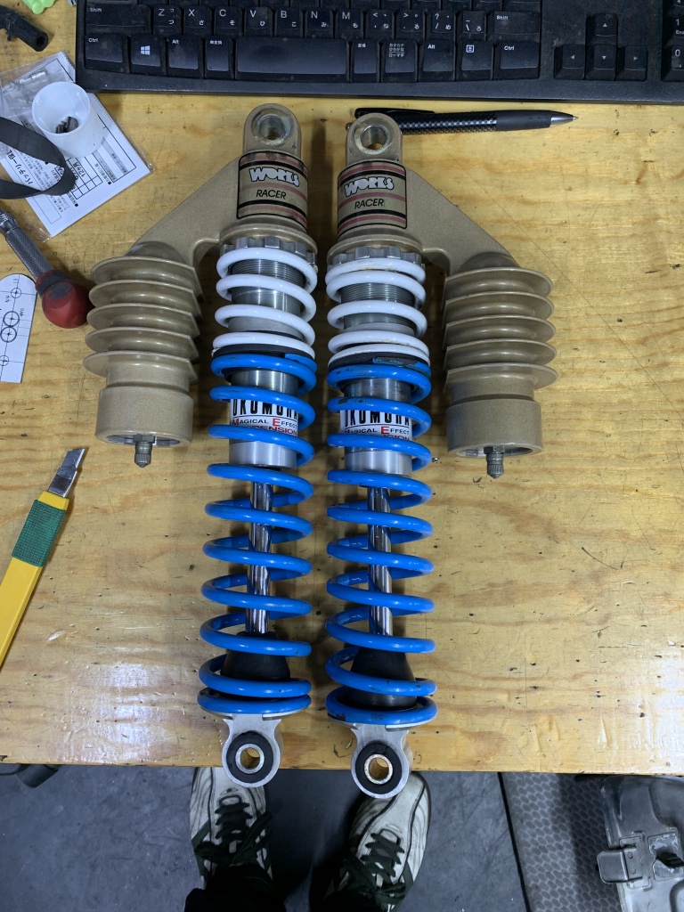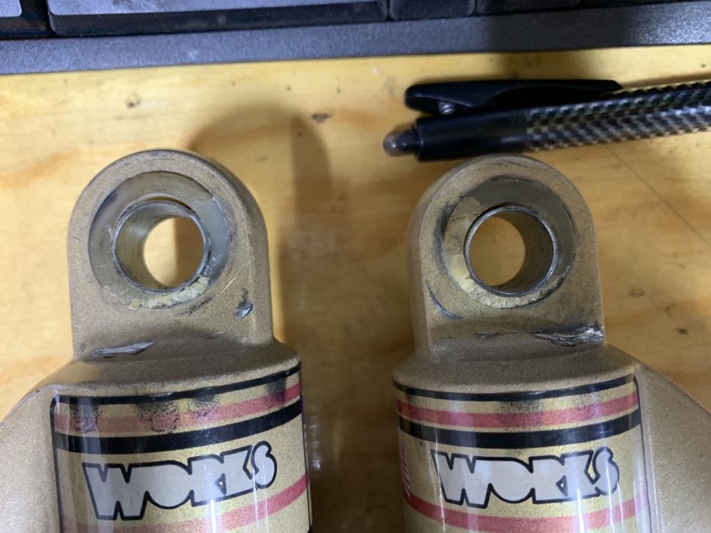 交換用に持ち込まれたワークスパフォーマンスのリヤショックを点検します。オーバーホール歴があるとのことですが、ちょっと問題がありそうです。