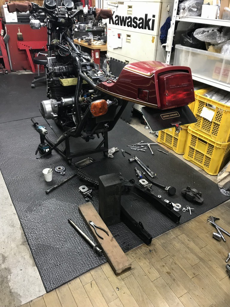 ステップはワークスバックステップVer.2に変更します。ステップはフレーム直付けになるので、ボスをフレームに溶接します。作業はスイングアームまでを外して行います。