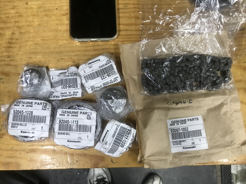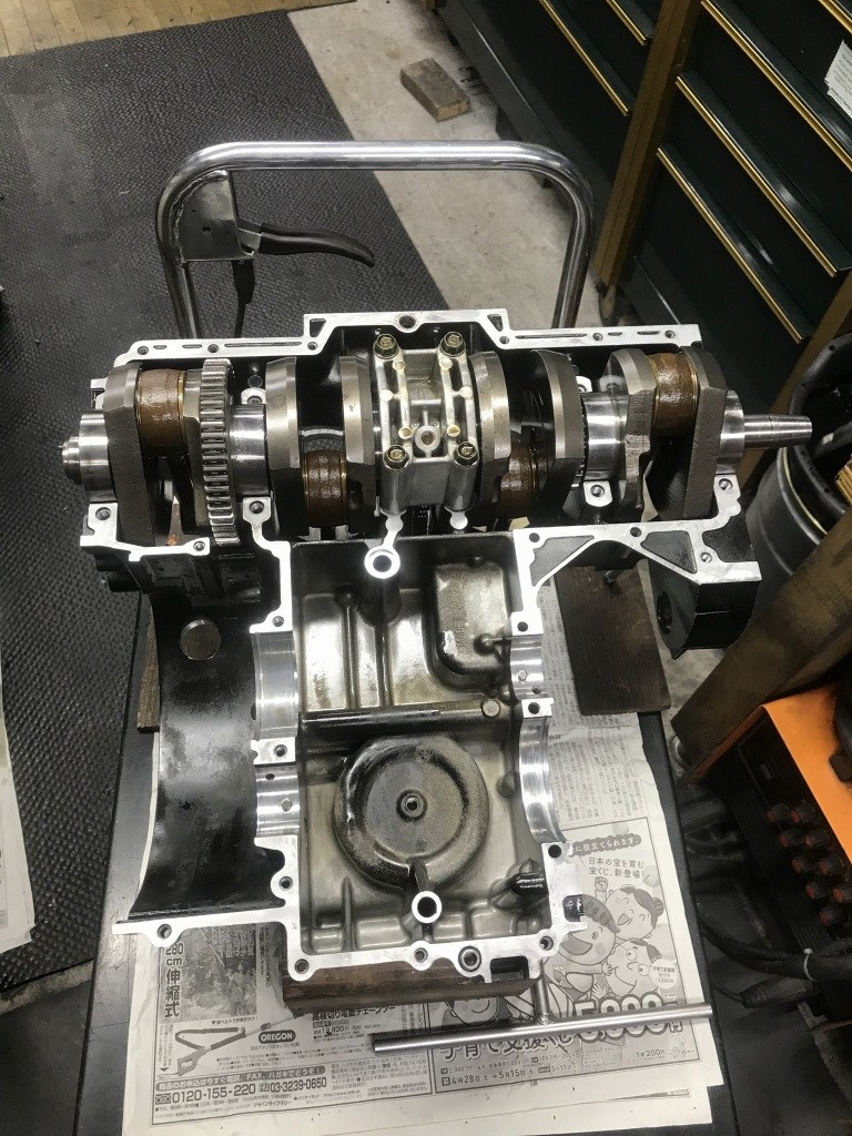 エンジン点検の結果、ピストンピンのスナップリング以外の破損は見つからなかったので、直ぐに復元作業に入ります。しばらく交換していなかったベアリング類とカムチェーンは新品交換することに。