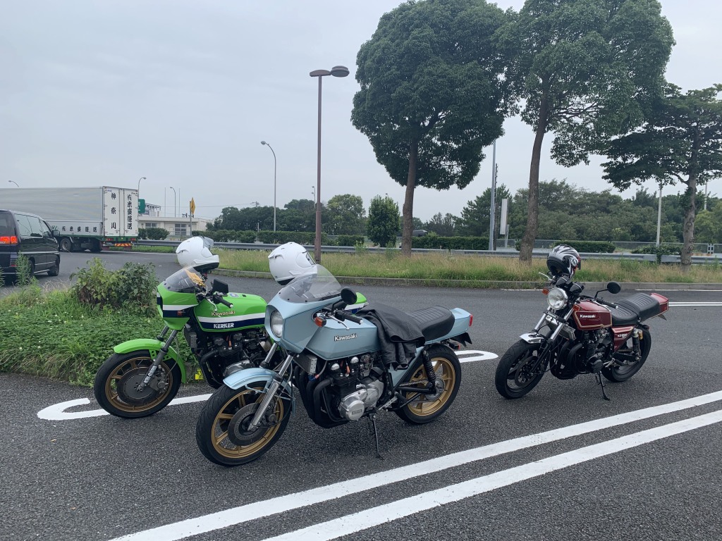 朝7時、集合場所の小田原厚木道路 平塚PAを出発します。今回の参加はこの3台です。梅雨の合間の今日、幸いにも降水確率は終日10%ですが、今にも降り出しそうな雲行きです。