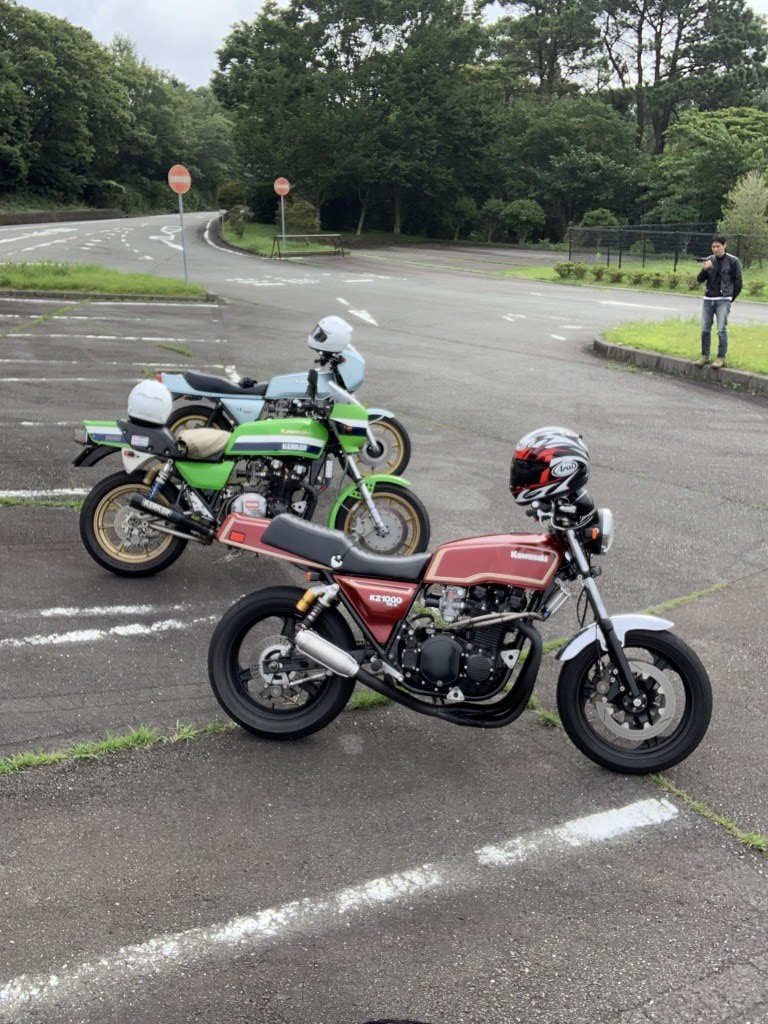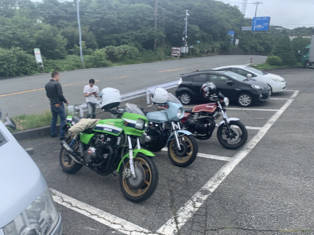 箱根七曲り、十国峠と進み、伊豆スカイラインの亀石パーキングに到着。途中、ガスっているところもありましたが、山の上も天気は大丈夫そうです。パーキングには常時バイクが20台ほど止まっている感じ。