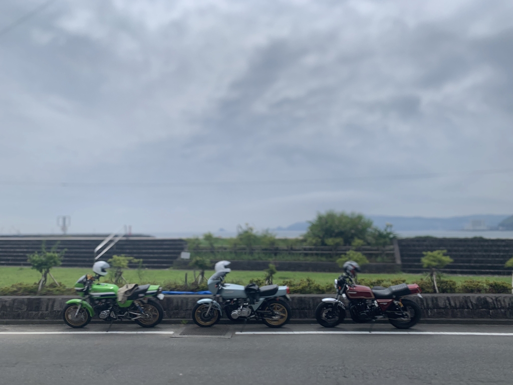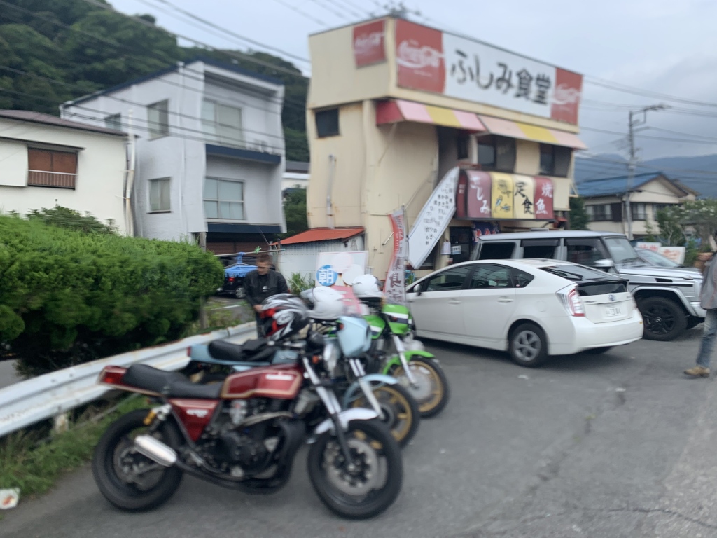 しばらく走りを楽しんだ後は、海岸線に下りて早めの昼食です。良く行く宇佐美のふしみ食堂へ。あいにく満席だったので10分ほど外で待ちます。画像が歪んでいるのは、iPhoneのカメラがブレているせい。手振れ補正付きのモデルは、バイクの振動でよくこうなります。