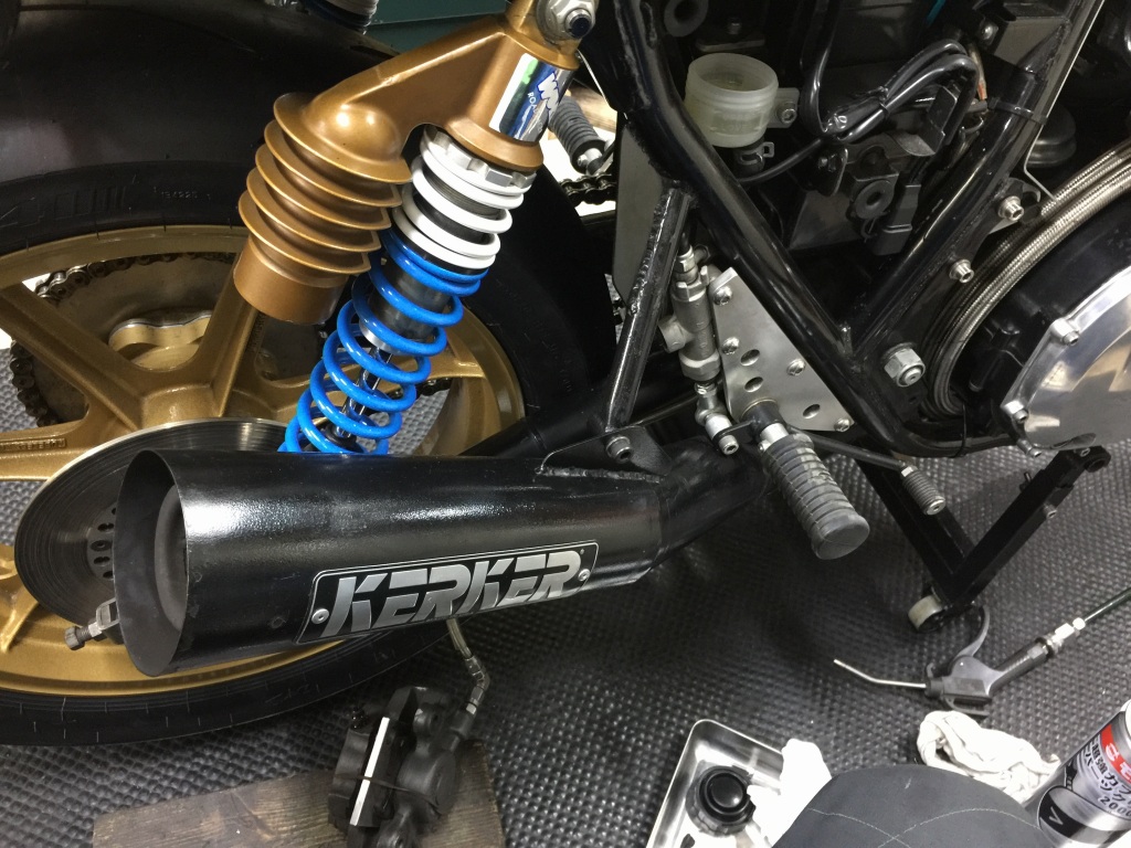 マフラーを外してエンジンオイルを抜きます。