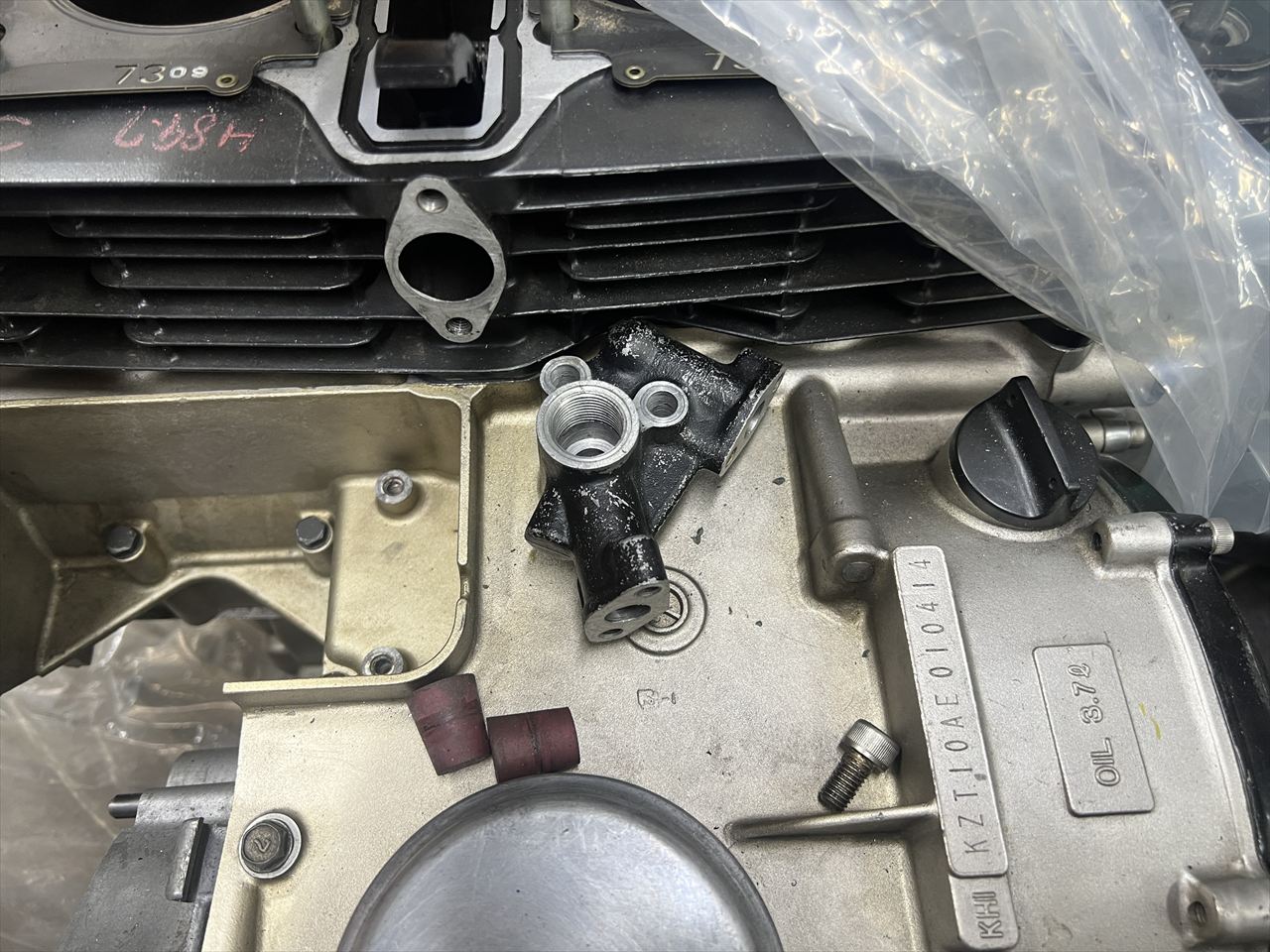 オイルクーラーは、コアのネジが傷んでいたりホースがサイド回しだったため、S1ルックにすべく全交換することになりました。オイル取出しはあえてS1と同じにせず、整備性のいい弊社オリジナルの純正加工タイプに変更します。