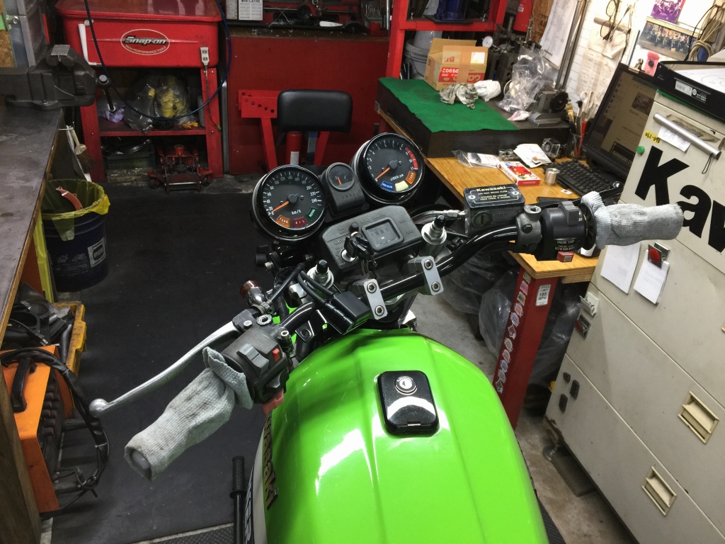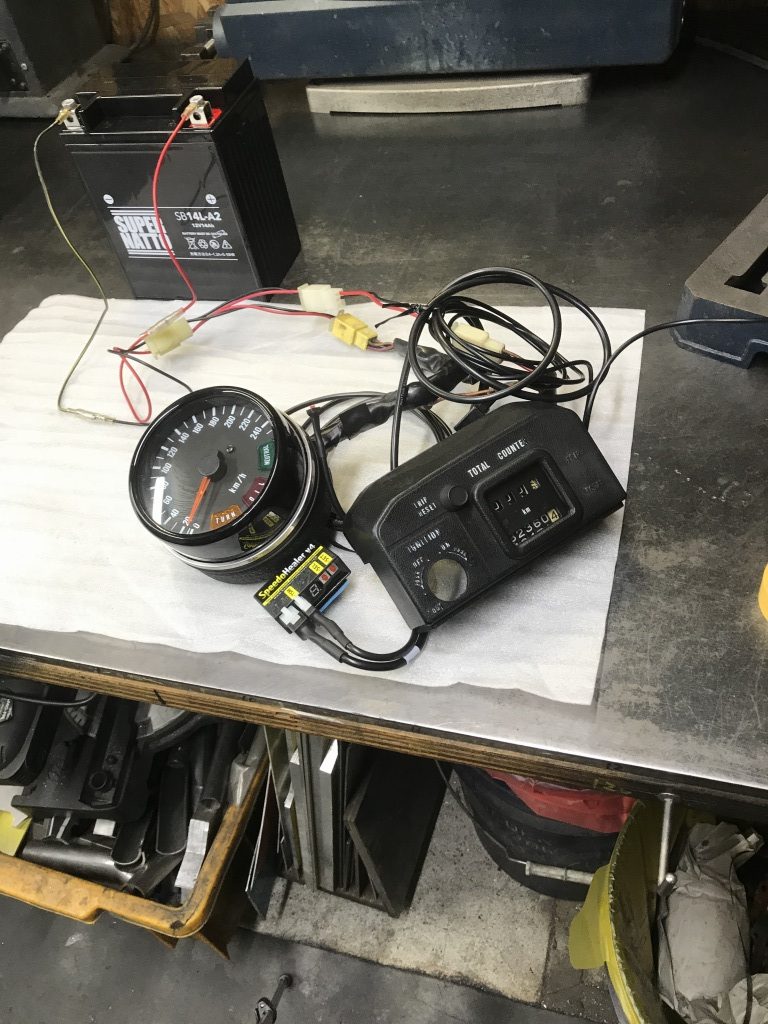 スピードヒーラーを介してオドメーターとスピードメータを繋ぎ、電源を投入します。スピードセンサーに信号を入れると、両メーターは作動しました。たまに針が下振れしますが、このへんは実際に走行した時どうなるか確認します。