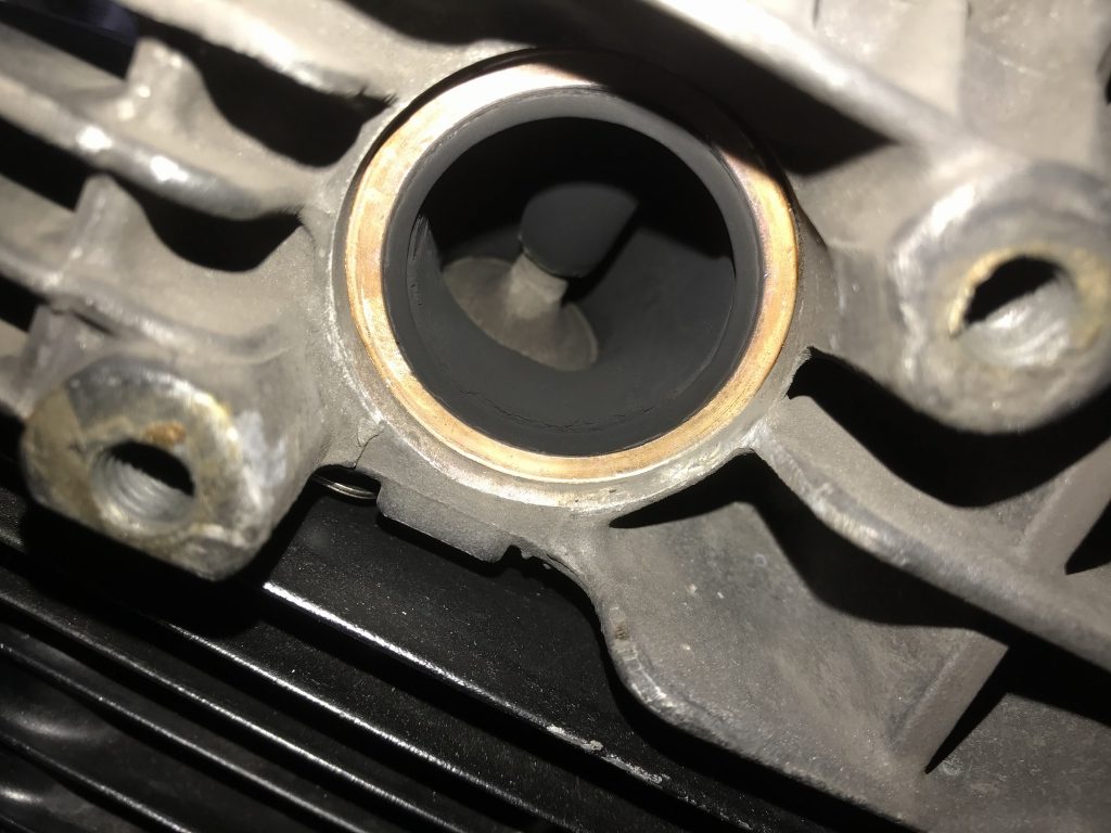 先日の走行ビデオで、エンブレシフトダウン時に少し白煙が出ていたので、エキゾーストポート内を点検します。4気筒とも特にオイルによる湿り気は無くこんな感じで、目立つオイル下がりなどは無いようです。
