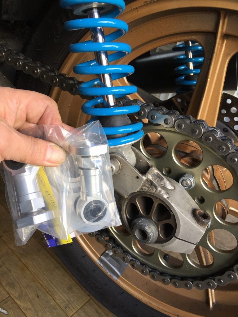 バンク角を稼ぐなどの目的でリヤショックを延長します。現在付いているワークスパフォーマンスは全長350ミリほど。現状はプリロードを最大限掛けている状態で、リバウンドストロークが不足しています。