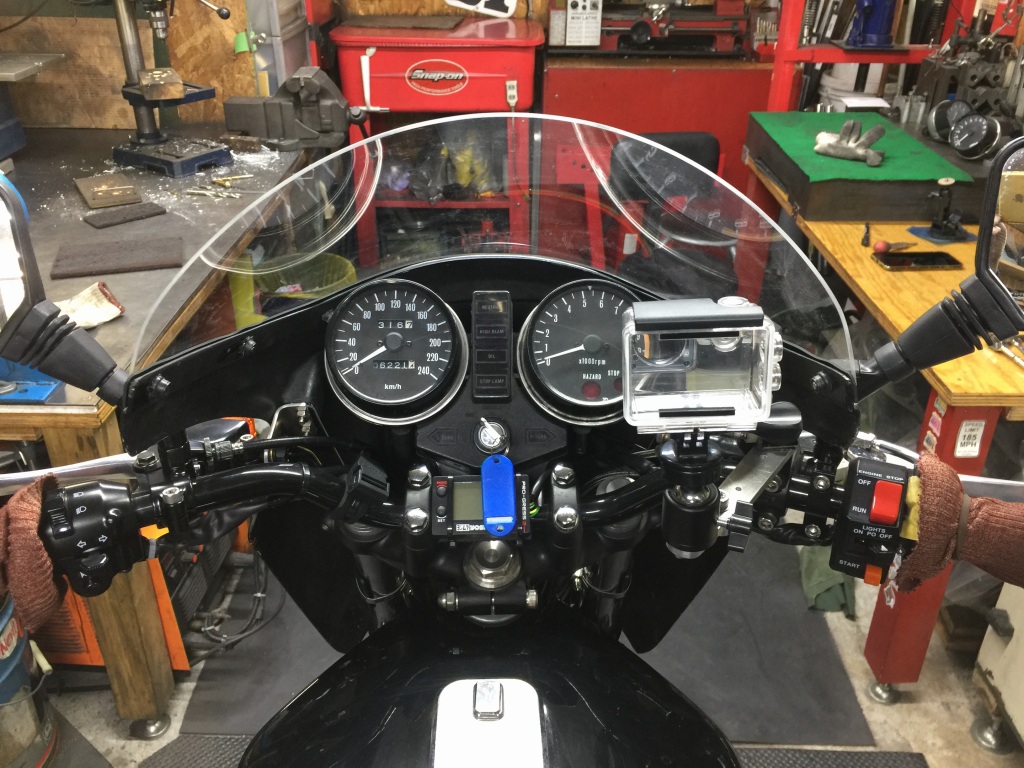 オンボード映像は、前方と一緒にタコメーターが映り込むと面白い映像になるのでこの位置に。