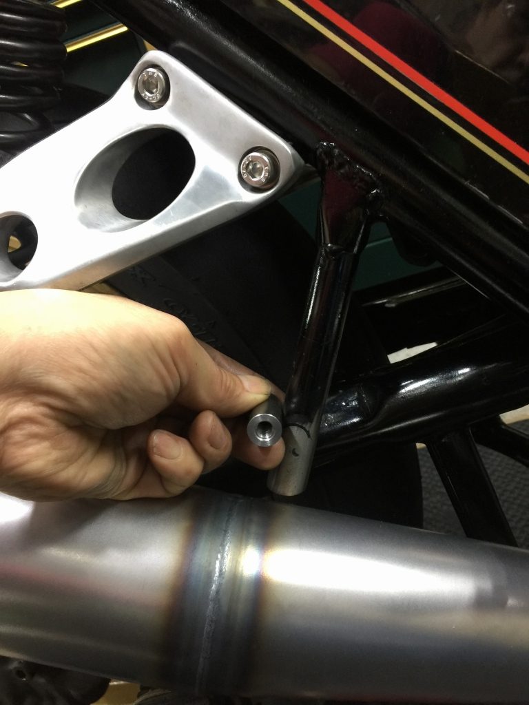 マフラーはこの辺りを通るので、ステーをカットしてこの辺りにボスを設置します。