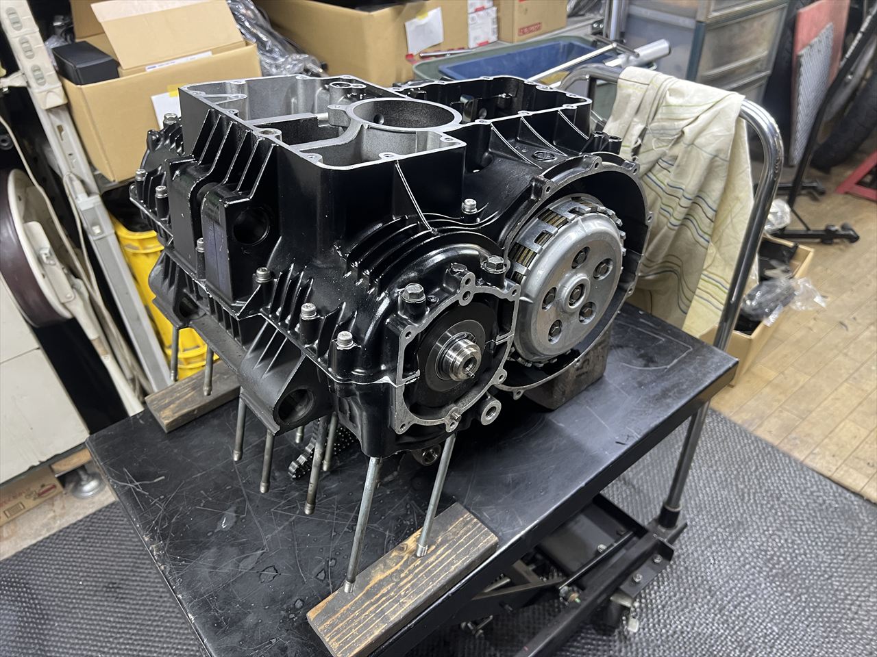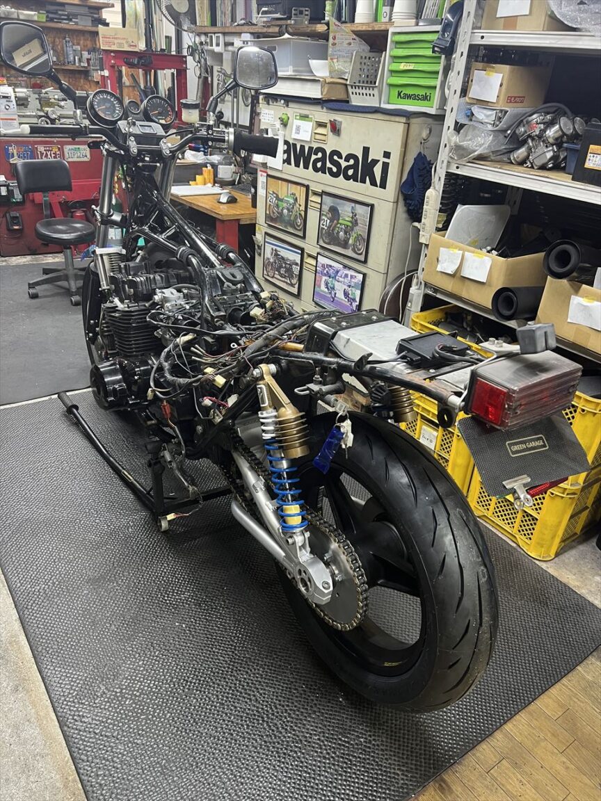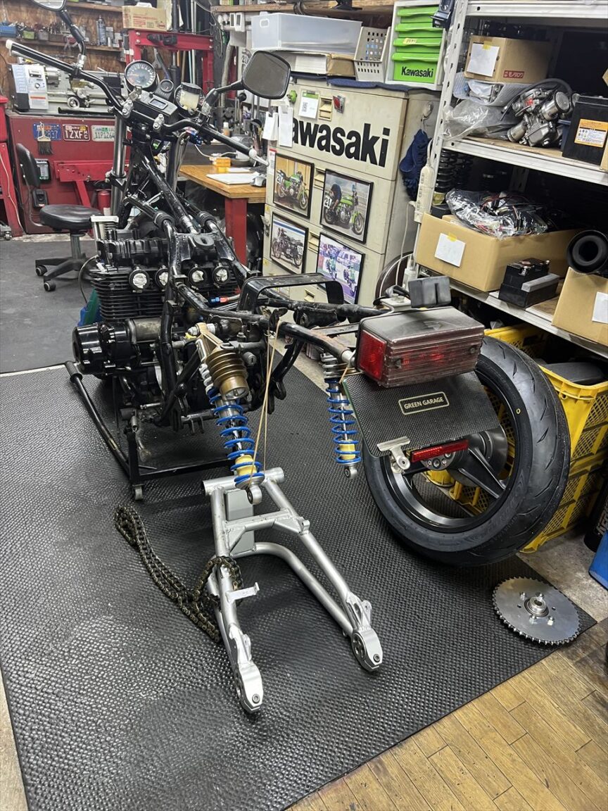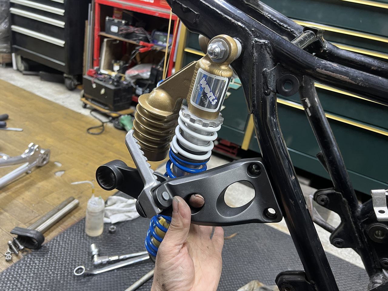リヤ周り作業の続きです。アクスルシャフト周りのカラー寸法が決まったところで、新しく下側にトルクロッドの受けを設置します。ちなみにこの既存のスイングアームは暫定で、これとは別にZRX400純正をベースにしたS1スイングアームレプリカを製作します。途中から追加されたアイテムで、製作に時間がかかるので後日改めて製作します。なので今回はこの既存のZRX400スイングアームを繋ぎに使います。