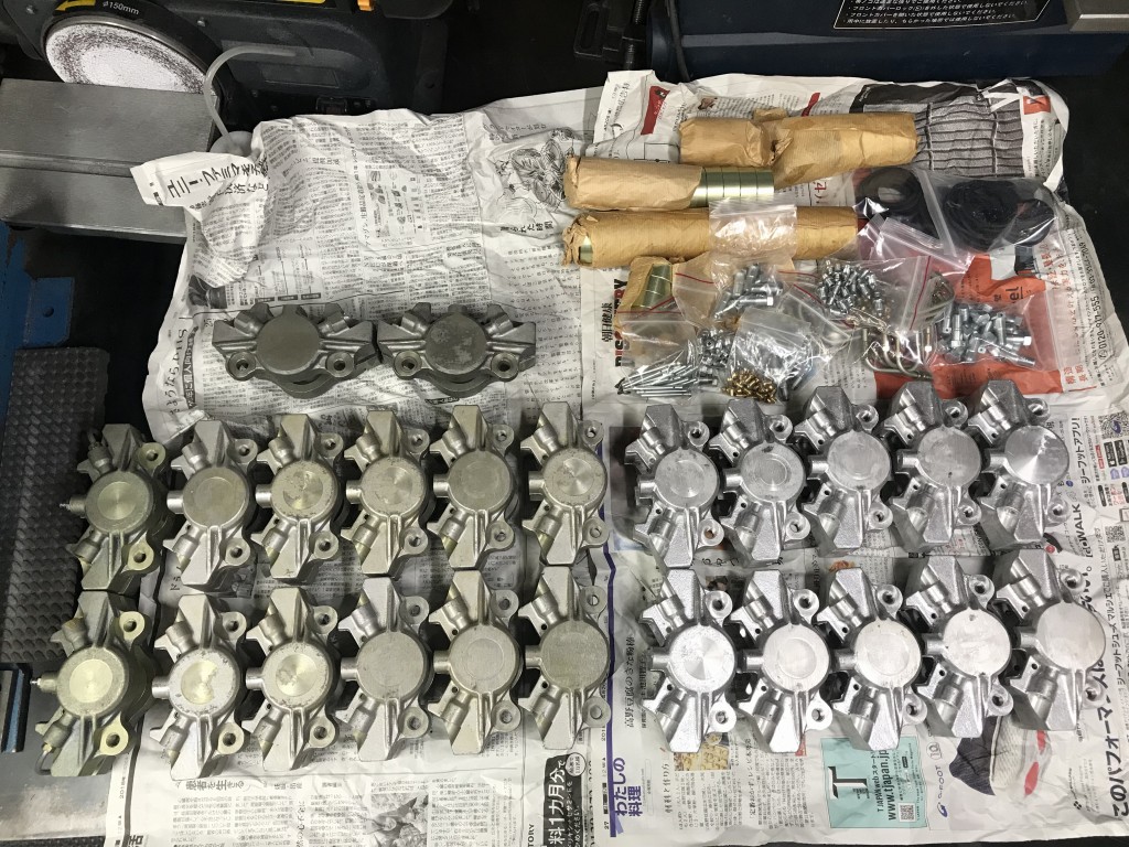 本物の形状を忠実に再現したS1キャリパーです。取り付けも本物と同寸法です。パッドは本物と同じくトキコレース用が使用できます。代用として現在、デイトナゴールデンパッドに装着できる製品がありますが、パッド摩材の取り付け位置がホイール中心に向かって7ミリほど寄っているため、専用のサポートなどが必要になります。補修部品の供給は基本的にできません。外観や色は1個1個若干異なります。