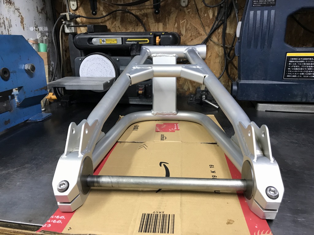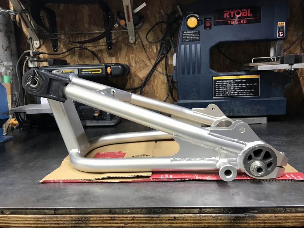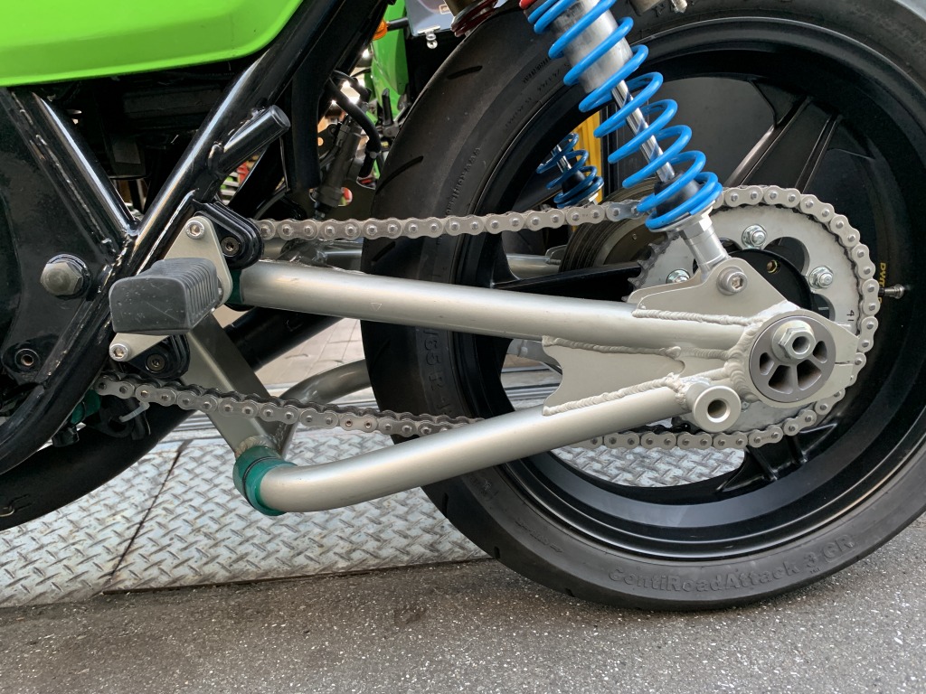 ZRX400純正スイングアームをベースに、S1風に加工した物です。Z1000J系フレームへの取り付けは、左側純正ステップブラケット内側の干渉部分を3ミリほど斜めに削る必要があります。サス受けの幅は左右とも10ミリオフセットです。